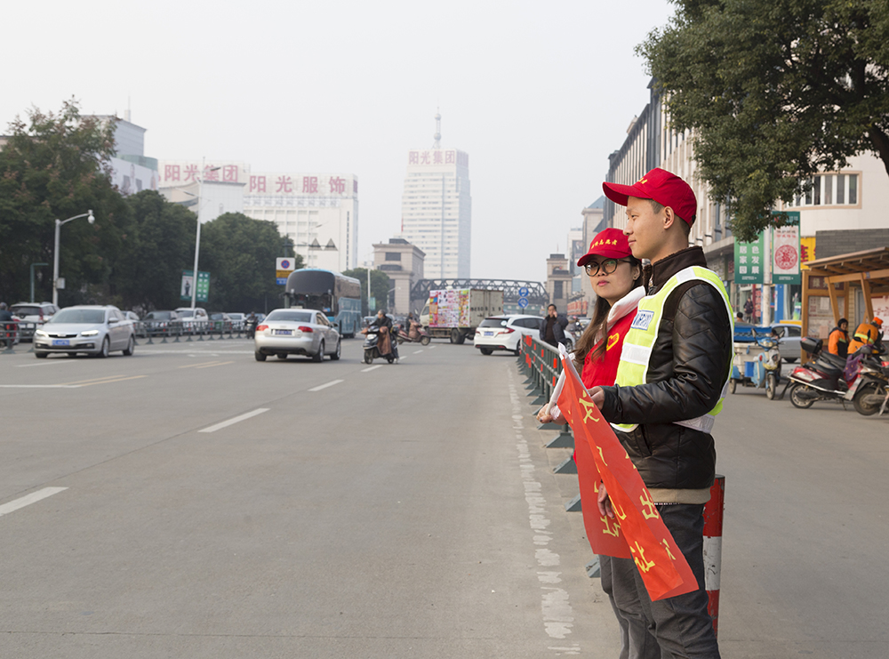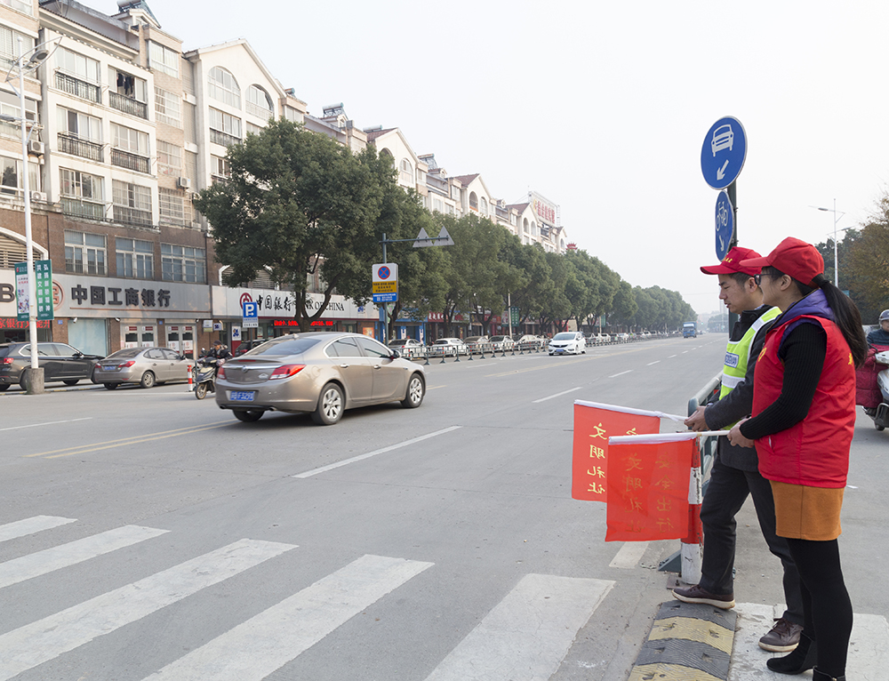 志愿者在上下班高峰期指挥交通